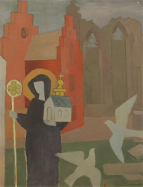 Kvinnligt helgon vid kyrka.