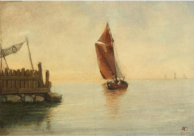 A sailing boat setting out.