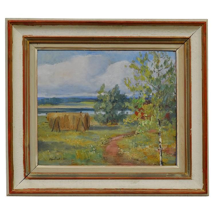 Landskap med höstack och träd.