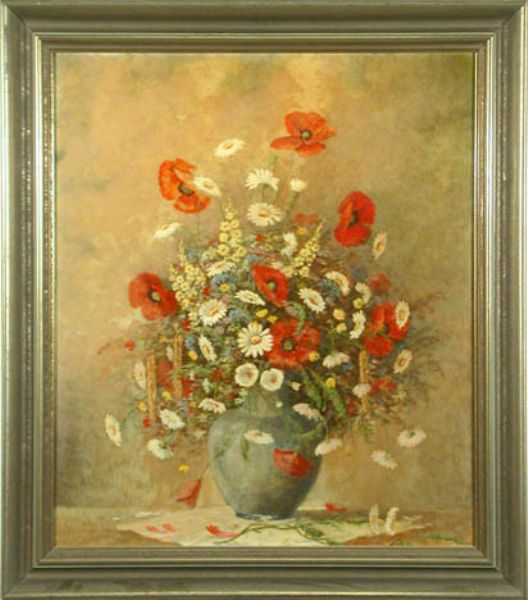 Tonvase mit Wiesenblumenstrauß und Ähren vor changierendem Hintergrund