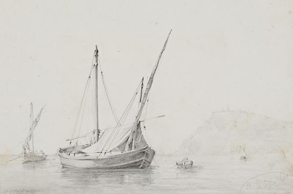 | Vista del puerto de Barcelona con Montjuic al fondo, y Unas barcas | |