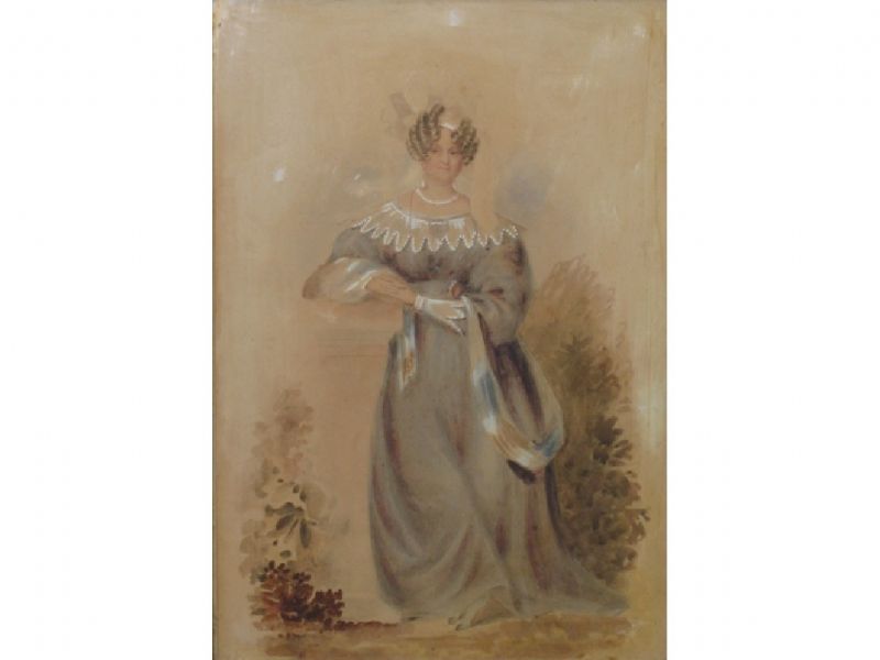 | A portrait of a lady standing full-length against a plinth in a garden | |