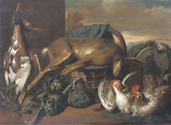| Game, including ducks and a hare on a basket, with artichokes and cockerels in a landscape | |
