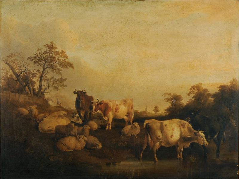 CATTLE AND SHEEP AT A COUNTRY POOL