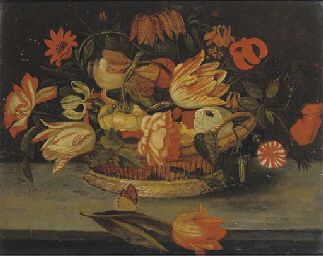 | Roses, tulips, fritillaries and other flowers in a basket on a ledge | |
