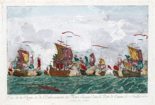| Vue de la Ruine, et de L´Embrasement des Flottes Turques dans le Port de Cismin le 7. Juillet 1770 | |