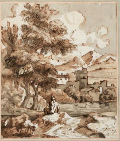 Berger et son troupeau près du château en ruine