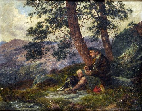 A Scottish Highlander and His Dog at Rest Beneath a Tree
