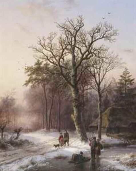 | A winter landscape with figures on a path and figures with a sleigh on the ice | |