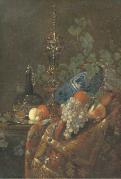 | Oranges in a Wanli 'kraak porselein' bowl, a peach and nuts on a silver plate, a glass vessel of wine, a gilt cup and cover and | |