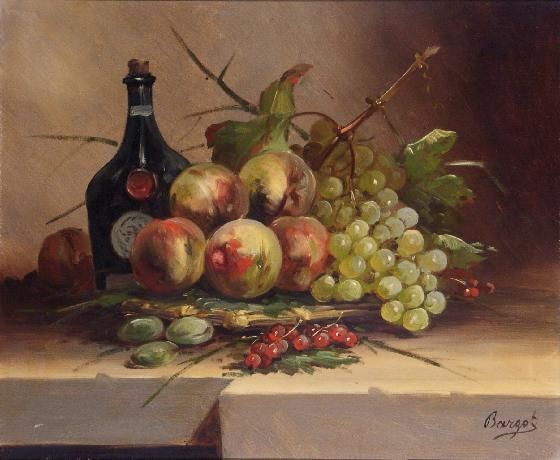 Stilleben mit Obst und Flaschen