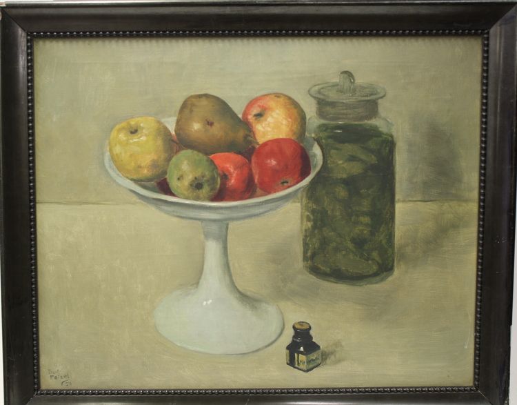 Stilleven met witte fruitschaal en pot augurken