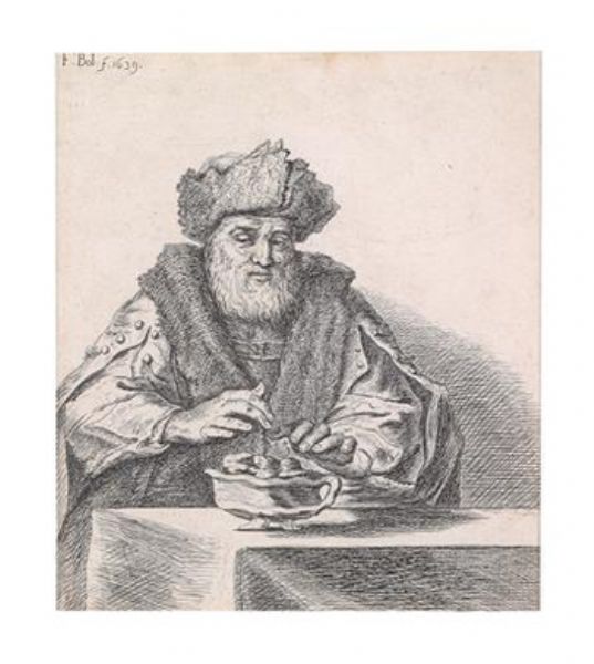 Old man with fur cap, warming his hands over a bowl, after Ferdinand Bol