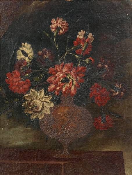 Carnations and other flowers in a bronze urn on a table top