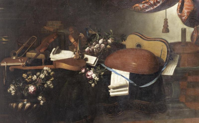 | An armillary sphere, a trumpet, books, a lute, a violin, a guitar and musical notebooks, fruit and flowers in an urn on a stone | |