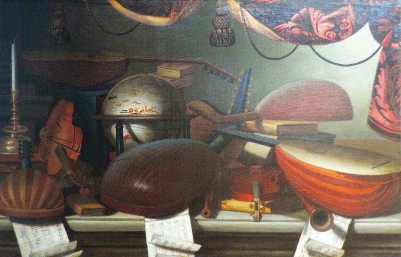 | Nature morte à la mappemonde, avec un violon, des mandolines, et des partitions de musique sur un entablement de pierre | |