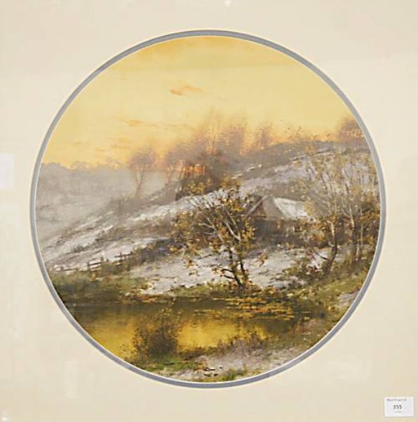 sunset over a winter landscape, a lakeside cabin in the foreground