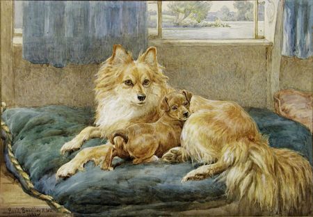 A DOG AND A PUPPY ON A CUSHION