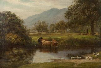 On the Falloch, Ben Vorlich, with cattle watering and ducks in foreground,