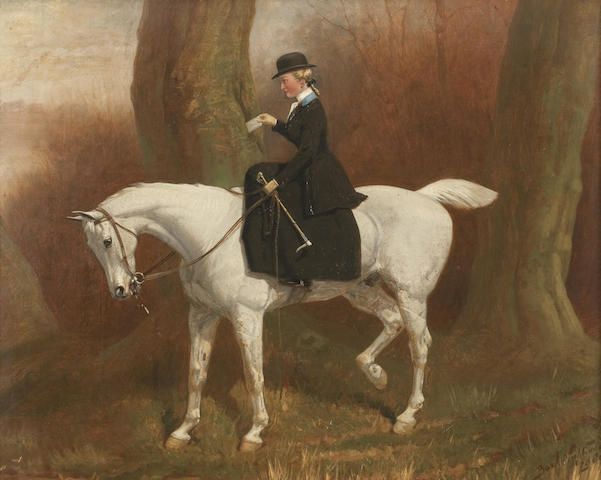White mare with a lady riding sidesaddle, hiding a love letter in a tree