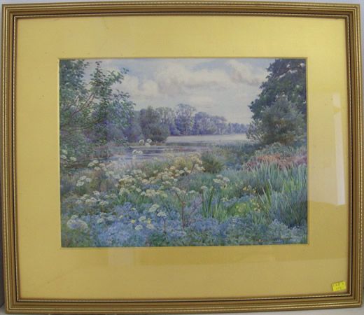 | Lake with rushes, bluebells, queen anne's lace with trees to the distance | |