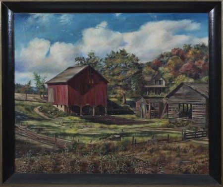 FARMSTEAD WITH RED BARN AND CORN FIELDS