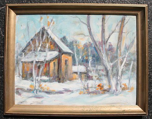 Snowy winter landscape with cabin