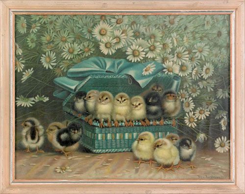 | Fifteen chicks playing in a blue basket surrounded by daisies | |