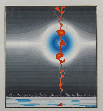 Oil painting depicting an abstract stylized landscape; signed Ben Zvi to lower left; 17 1/2" x 15 3/4" (sight, approx.); framed | |