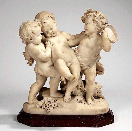 | Groupe en marbre blanc représentant trois amours dont deux satyres. L'un tenant un tambourin, ils reposent sur une base ovale dé | |