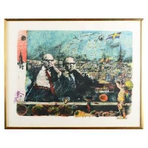 Symbolisk scen med Gunnar Sträng framför Stockholm.