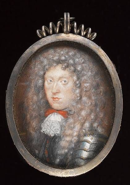 | A Gentleman, wearing gilt-studded armour with red lining, white lace jabot tied with red ribbon bow and long powdered wig | |