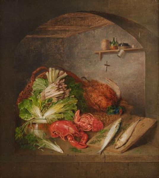 | Kitchen Still Life with Asparagus, Poultry and Lobsters | |