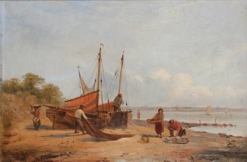 Fisherfolk on the shore, probably the Mersey near Eastham