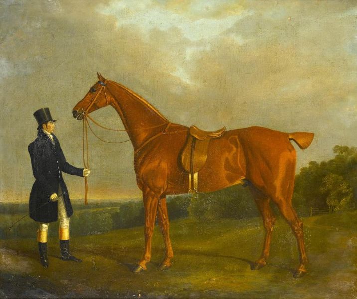 | PORTRAIT OF A CHESTNUT HUNTER WITH ITS OWNER IN AN EXTENSIVE LANDSCAPE | |
