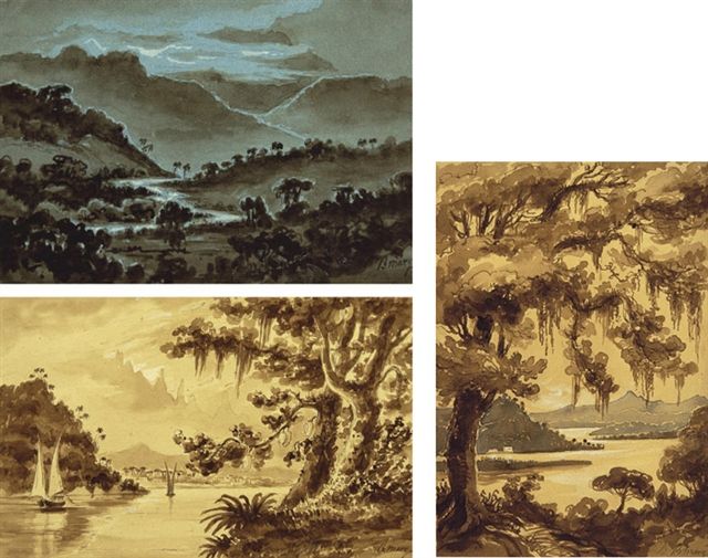 | Wash brown and blue washes heightened with white on paper, unframed, 7 items | |