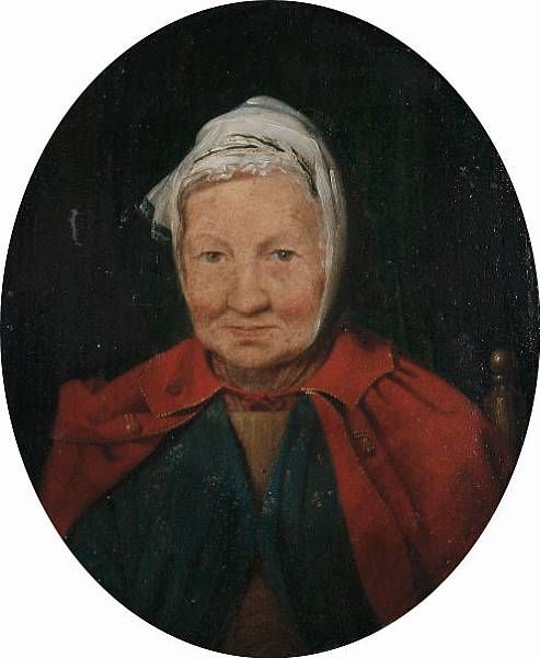 | Portrait of an elderly lady, bust-length, in a blue dress with a red cape and a white lace cap | |