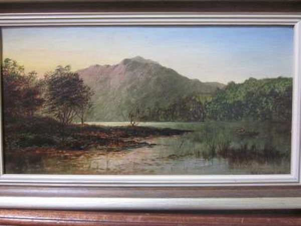 | Mountainous lakeland landscape with figure in a rowing boat | |