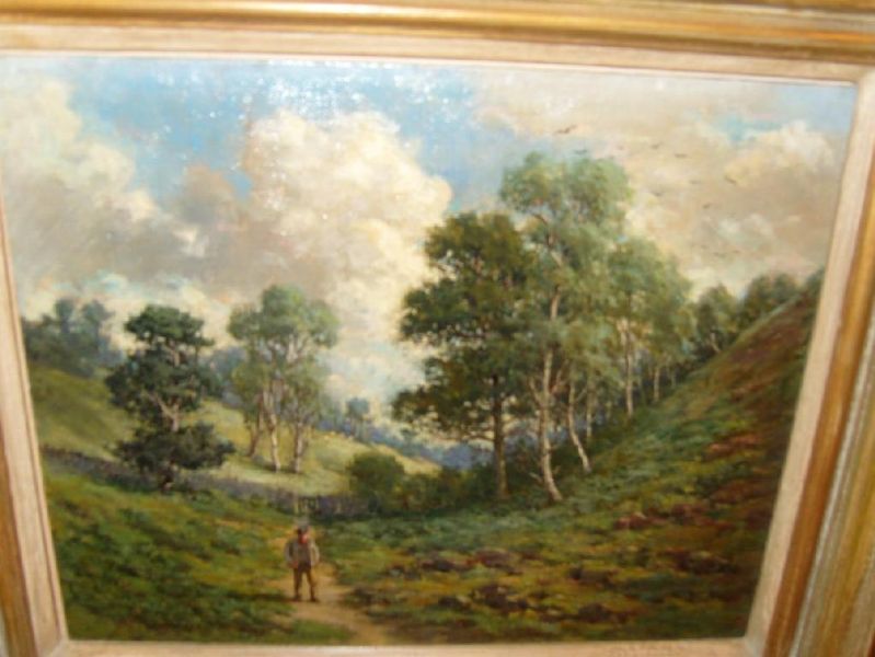 | Showing a country landscape with male figure walking along a pathway at the foot of a wooden valley with sheep grazing to the di | |