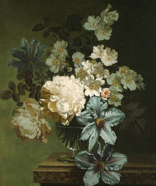 | Still life of white peonies, blue clematis and other flowers in a glass vase on a ledge | |