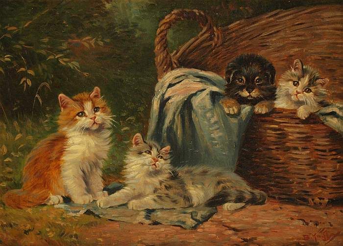 Hundewelpe mit drei posierlichen jungen Kätzchen.