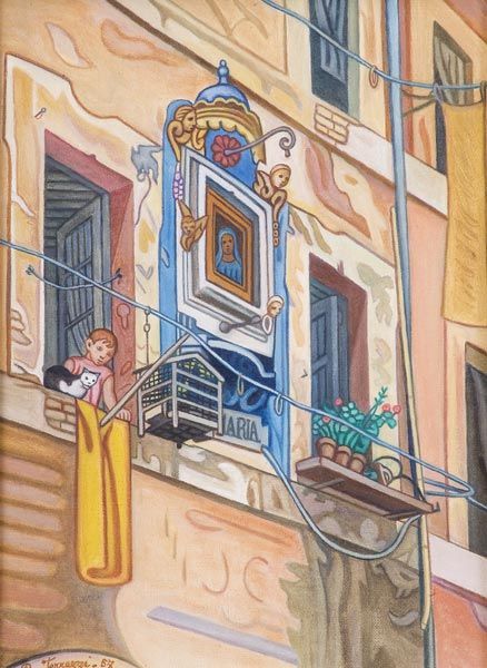 | Facciata di palazzo con edicola della Vergine col Bambino e gatto alla finestra, 1957 | |