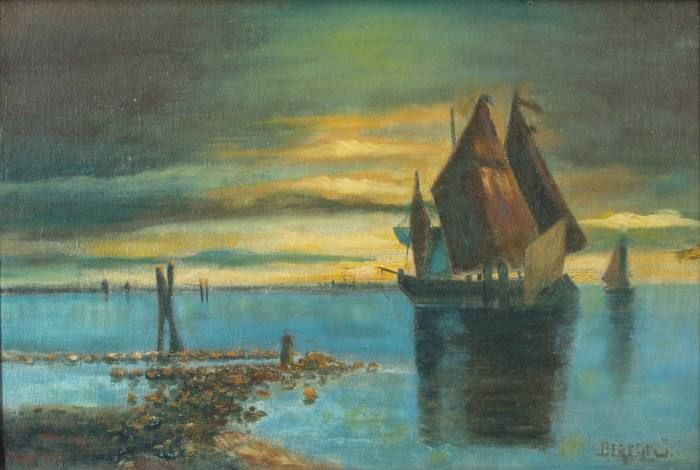 J. Seelandschaft im Sonnenuntergang mit Segelschiffen
