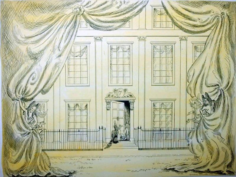 | A Georgian town house with figures at the door, seen through curtains held back by angels | |