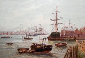 Moored fishing vessels in a busy harbour with a townscape and chimneys beyond