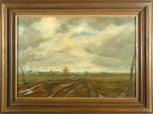 Blick auf ein kleines Dorf unter schwefligem Gewitterhimmel