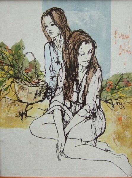Study of two young girls picking flowers