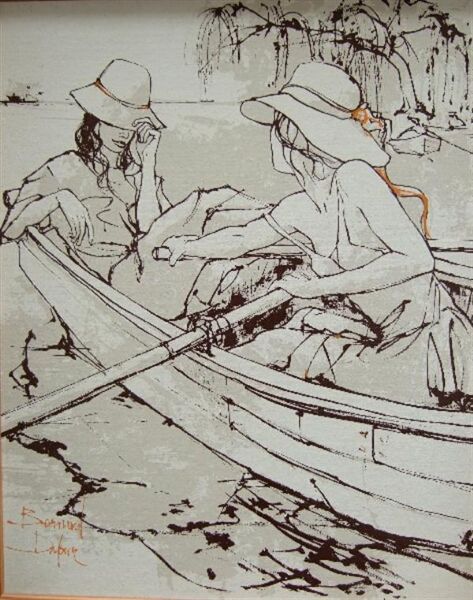 Study of two young girls rowing a boat