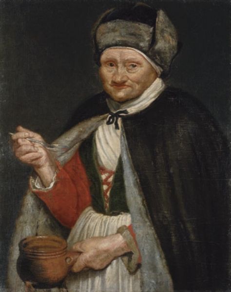 | An Allegory of Taste: Portrait of a lady, half-length, in a black fur-lined cape, holding a silver spoon and terracotta bowl | |