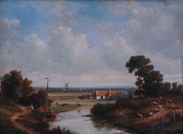 Landschap met fuguren en vee, op de achtergrond een molen